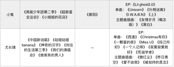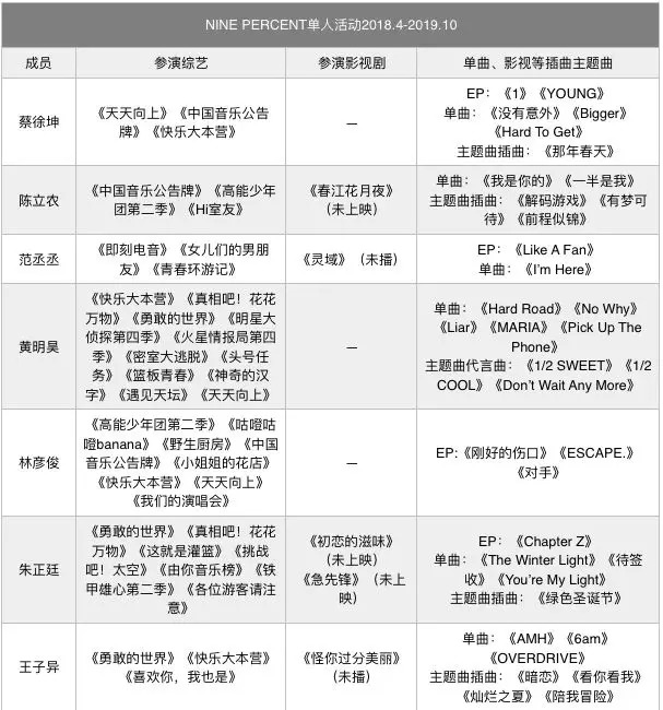 注:本表数据整理自网络,未收录NINE PERCENT三人及以上同时共同参与的综艺及音乐作品