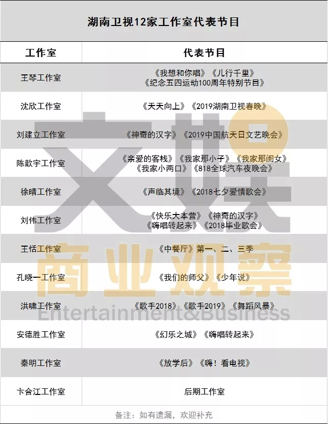 比如说,湖南卫视当家的两大王牌周播节目《快乐大本营》和《天天向上》,这两档节目幕后的团队分别为刘伟工作室和沈欣工作室,他们分别都在主营业务以外,也有拓展业务,参加到其他节目的制作过程中。