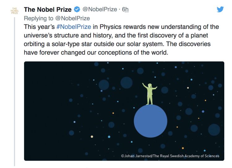 “今年的诺贝尔物理学奖奖励了人们对宇宙结构、和宇宙历史的新认识,也奖励了人类首次发现的绕日行星。”