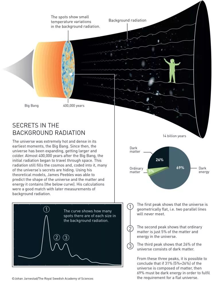 而另一位获奖者詹姆斯·皮布尔斯今年已经 84 岁了,在得奖之前,他已经在宇宙微波背景辐射领域工作了近六十年。正是他多年以来的工作,成功地把物理宇宙学从抽象科学变成了一门能定量、能计算的科学。