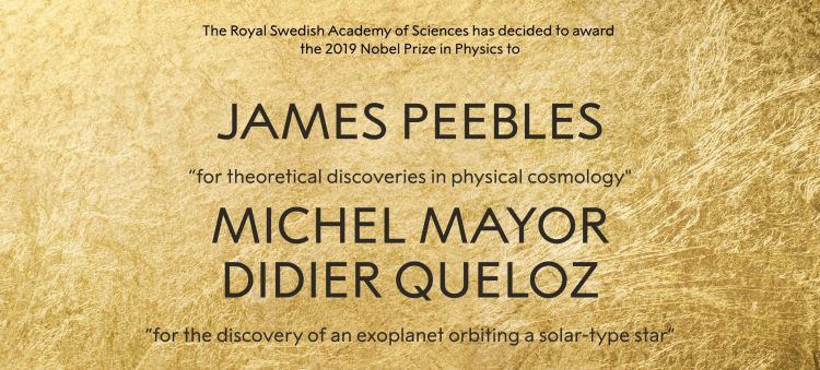 北京时间2019年10月8日17时50分许,瑞典皇家科学院在斯德哥尔摩宣布,2019 年诺贝尔物理学奖由美国普林斯顿大学教授詹姆斯·皮布尔斯(James Peebles )、瑞士日内瓦大学天文教授米歇尔·梅耶尔(Michel Mayor),以及他的学生迪迪埃·克罗兹(Didier Queloz)共同获得。