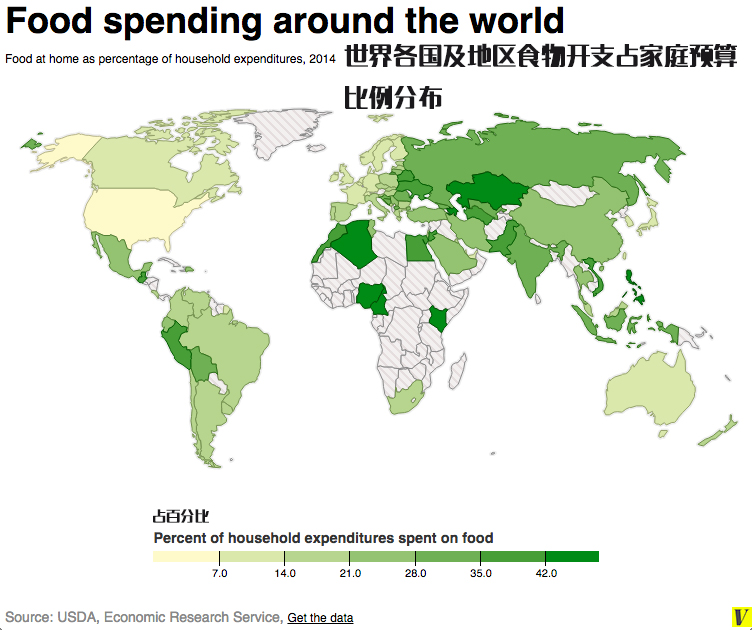 美国农业部经济研究服务机构(USDA Economic Research Service)对世界各地家庭的食物、酒精及烟草开销进行了调查。