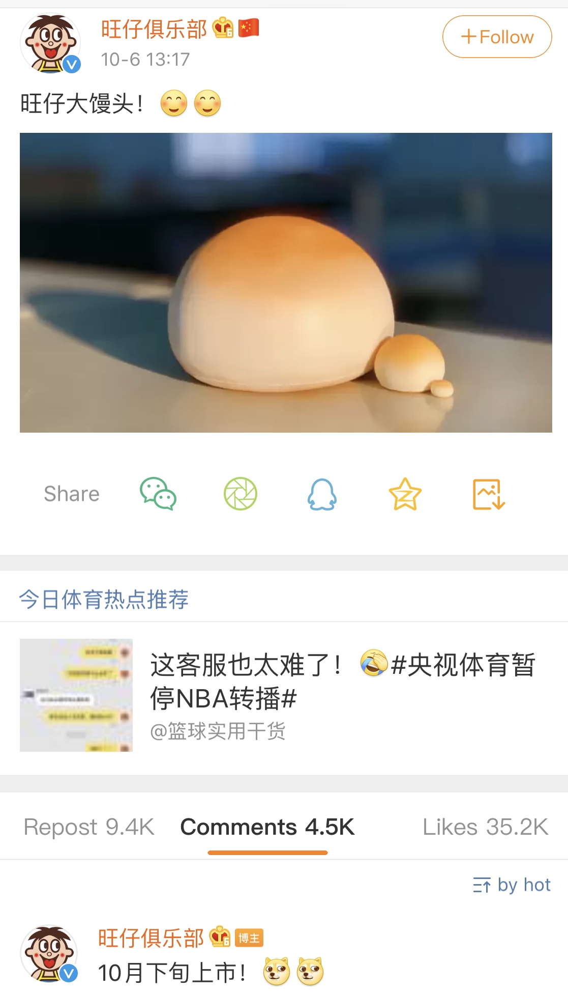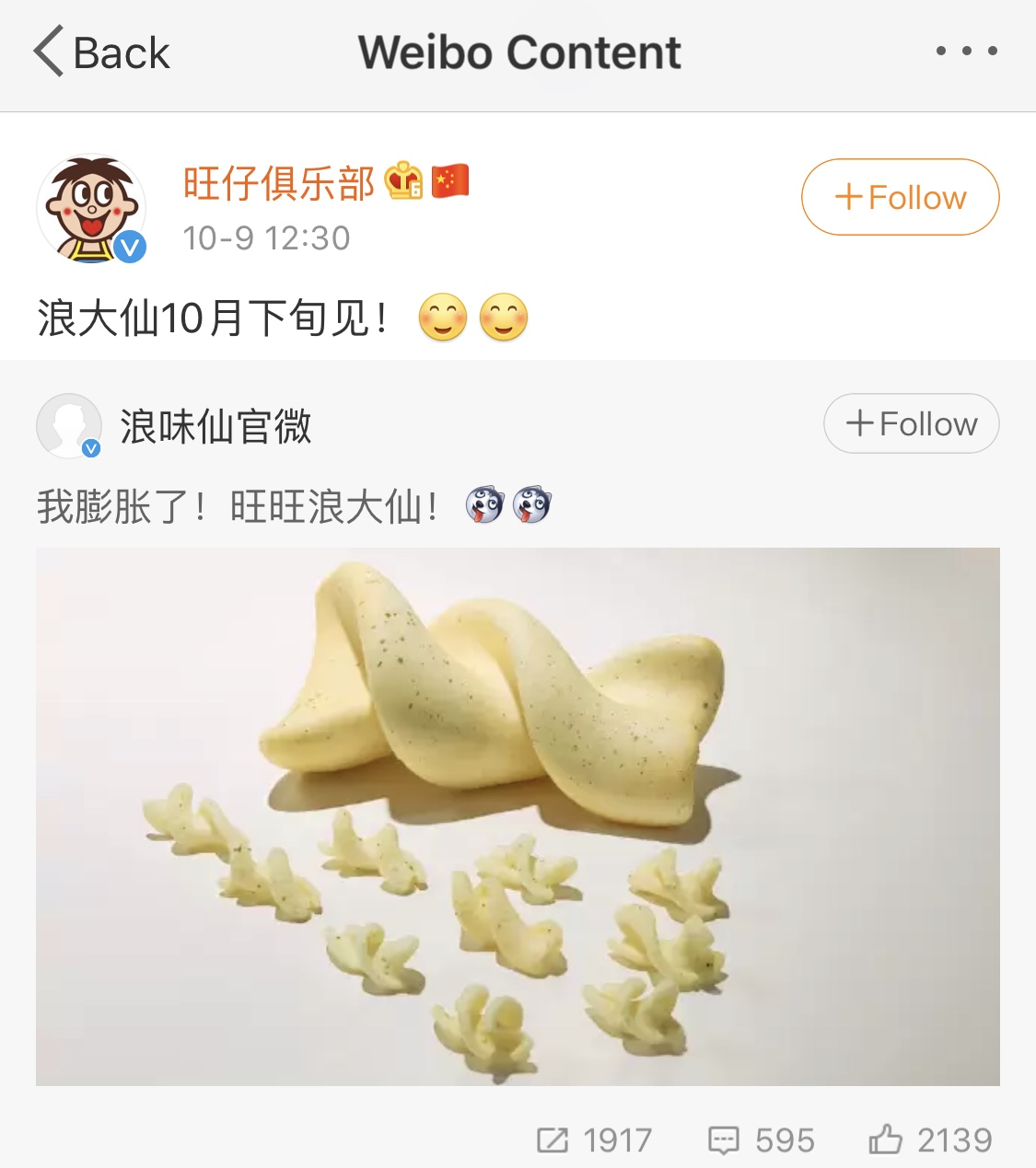 10月6日,微博账号“旺仔俱乐部”发布消息称,10月下旬将推出旺仔大馒头。两天后,该账号又转发了“浪味仙官微”的微博,宣布浪味仙增大版“浪大仙”也将于10月下旬推出。