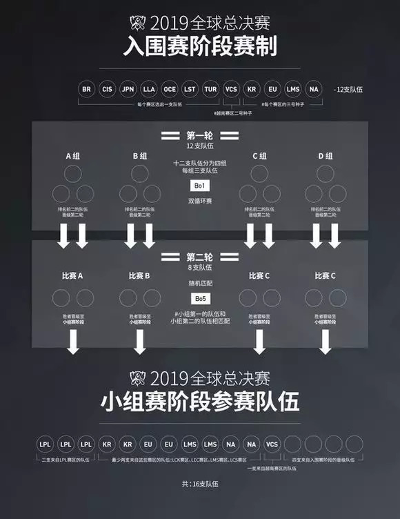 今年世界赛赛制与往年不同:由于过去两年内,LPL赛区在2018季中冠军赛和2018全球总决赛等国际大赛上多次斩获重要奖项,因此将会获得三个小组赛阶段的名额;越南赛区(VCS)今年将会获得两个席位:去年他们作为一个独立赛区参赛,因此获得了第一种子队伍的名额。而根据越南赛区在往年季中冠军赛上取得的优异名次,他们将可以获得第二个种子队伍的名额。VCS的第一种子队伍将会从小组赛阶段开始比赛,第二种子队伍将会从入围赛阶段开始比赛。