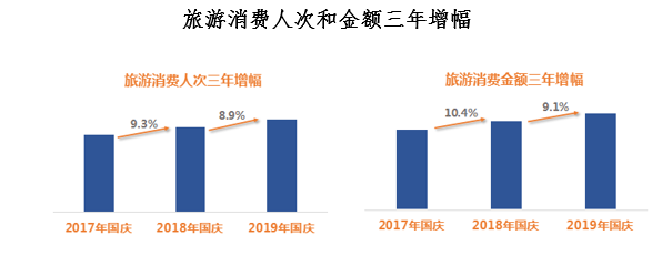 《报告》称,2019年国庆期间,我国居民出游热情呈现出持续高涨的趋势。根据银联商务最近三年数据显示,全国国庆旅游消费金额同比增长9.1%,旅游消费人次同比增长8.9%。