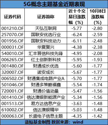 受科技股调整影响,众多科技主题基金最近开始回吐此前收益。以wind分类上的5G概念主题基金为例,截至目前,全市场共有30余只5G概念主题基金,这些基金自9月下旬以来均出现了不同程度的下跌,近十个交易日有多只基金跌幅超过5%,10月8日更是有5只基金跌幅超过2%,22只基金跌幅超过1%。