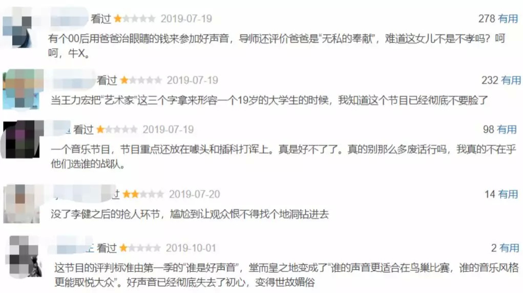 在这样的对比中,有人评论道:如今的《好声音》已经不能算新瓶装旧酒了,简直是在制售过期食品。