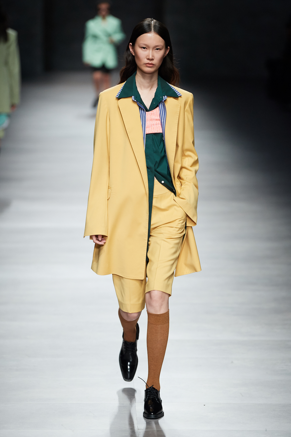 这一季延续了pushBUTTON的未来感,在衬衫、Polo夹克和Polo衫中都加入了蓬乱、有空气感的廓型。紧身夹克和连衣裙带有18世纪夸张的洛可可风格,不对称设计也体现了pushBUTTON一贯的疯狂趣味。色彩丰富鲜亮,整体有90年代的复古摩登感。