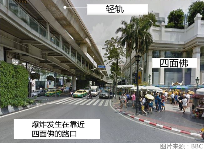 爆炸案发生点附近的这座四面佛寺修建于1956年,原本是属于旁边君悦大酒店的范围。因为当年在君悦大酒店施工的时候发生了多起意外,为了祈求保佑施工顺利所以修了这座四面佛。之后,四面佛便成为了曼谷旅游的热门景点,前来朝拜许愿的人络绎不绝。佛寺四周购物中心林立,曼谷轻轨在附近也设有站点。