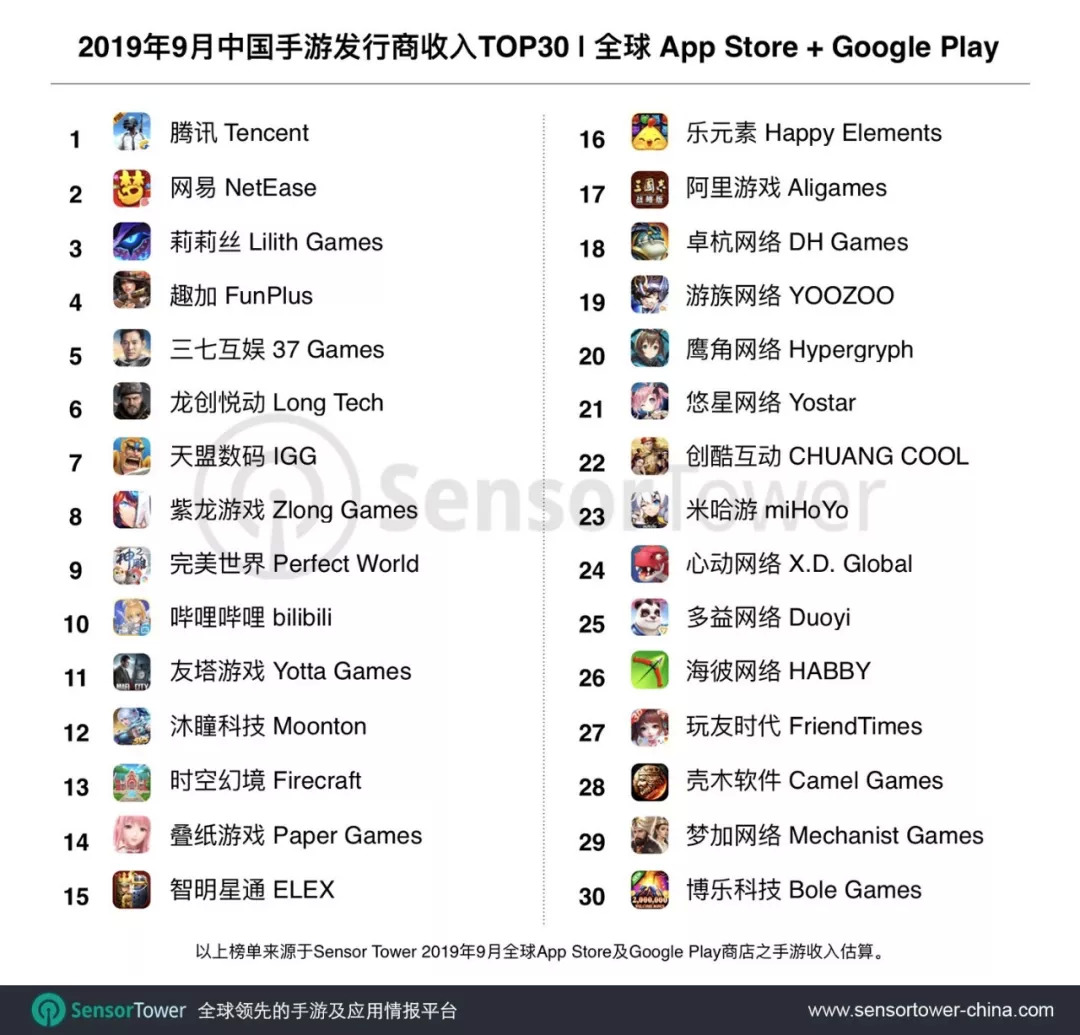 昨日,Sensor Tower发布了2019年9月中国手游发行商在全球App Store和Google Play的收入排名(榜单依然不包含国内第三方安卓市场的收入)。