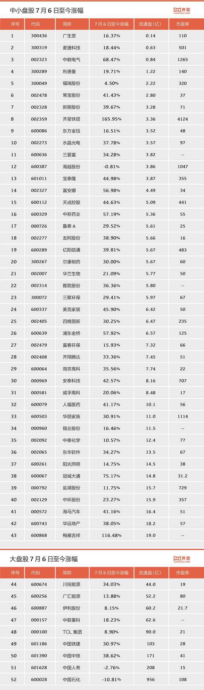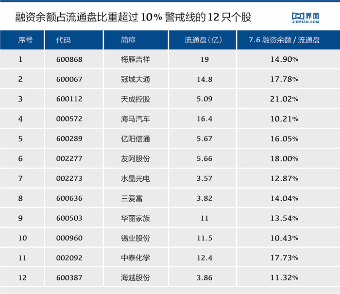 界面新闻记者梳理这52家上市公司发现,流通盘在20亿以下的中小盘股票有43只,而在这43只个股中,27只个股是融资融券的标的股票。其中,7月6日融资余额占流通盘比重超过10%警戒线的个股有12只。此外,剩下的个股,除齐星铁塔外,均在7月6日前后经历过“跌停潮”。
