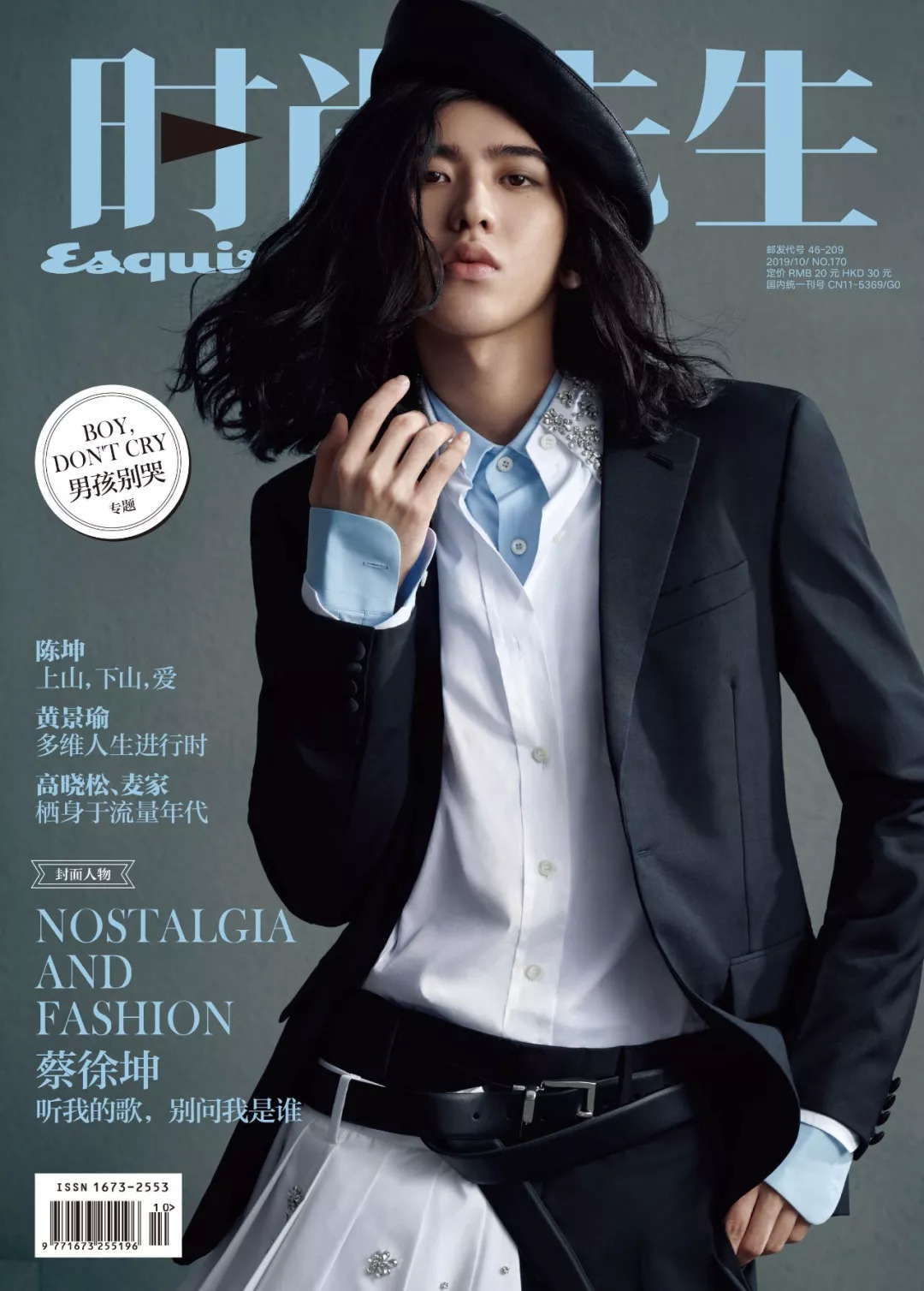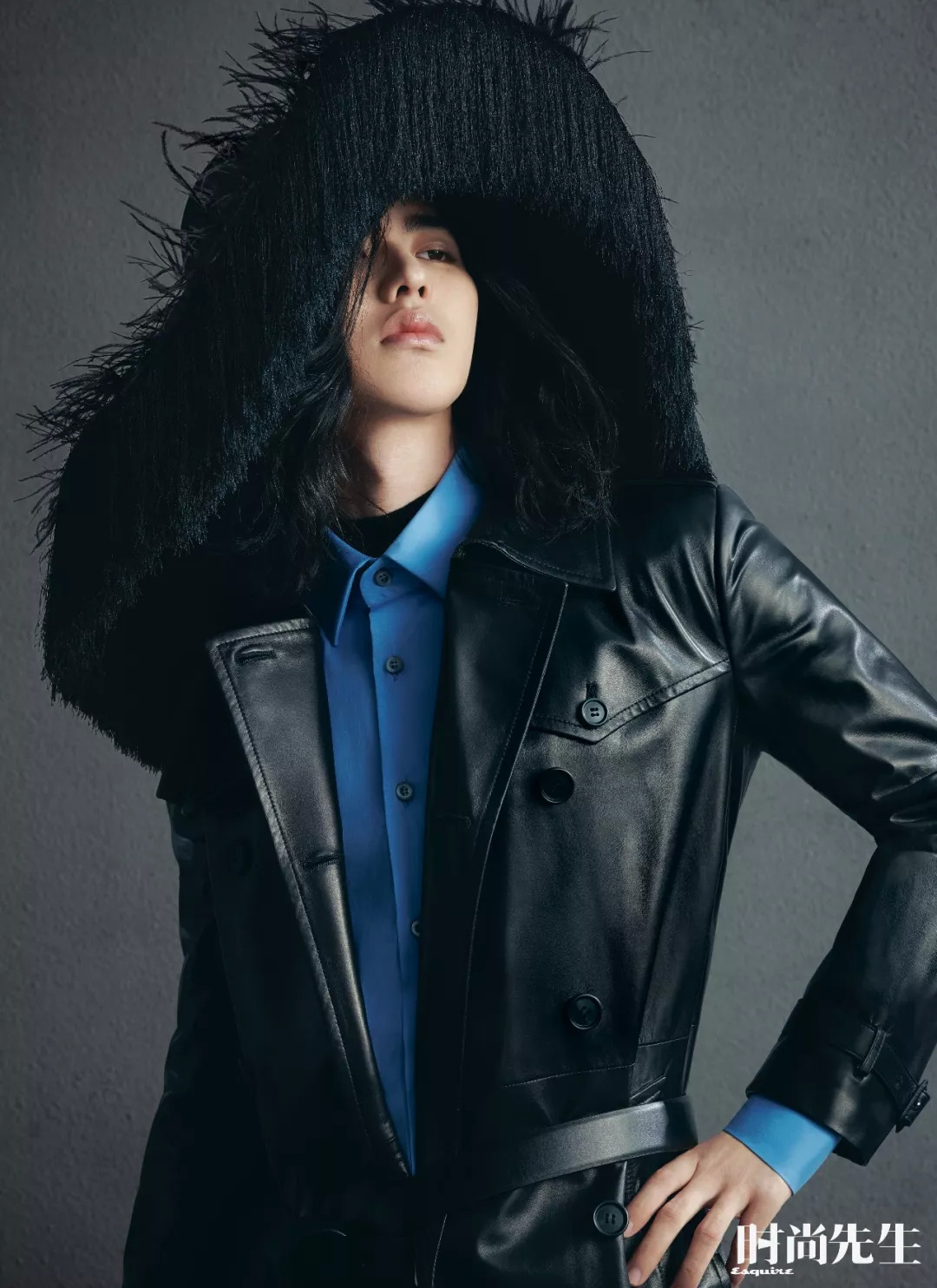 摄影棚里搭出一个宽大的书架,盛满旧书。两只单人沙发,一个小方几,制造出古旧的年代感。这是这次Esquire为蔡徐坤的拍摄搭建的场景。拍摄中,他还尝试了黑色的长发。