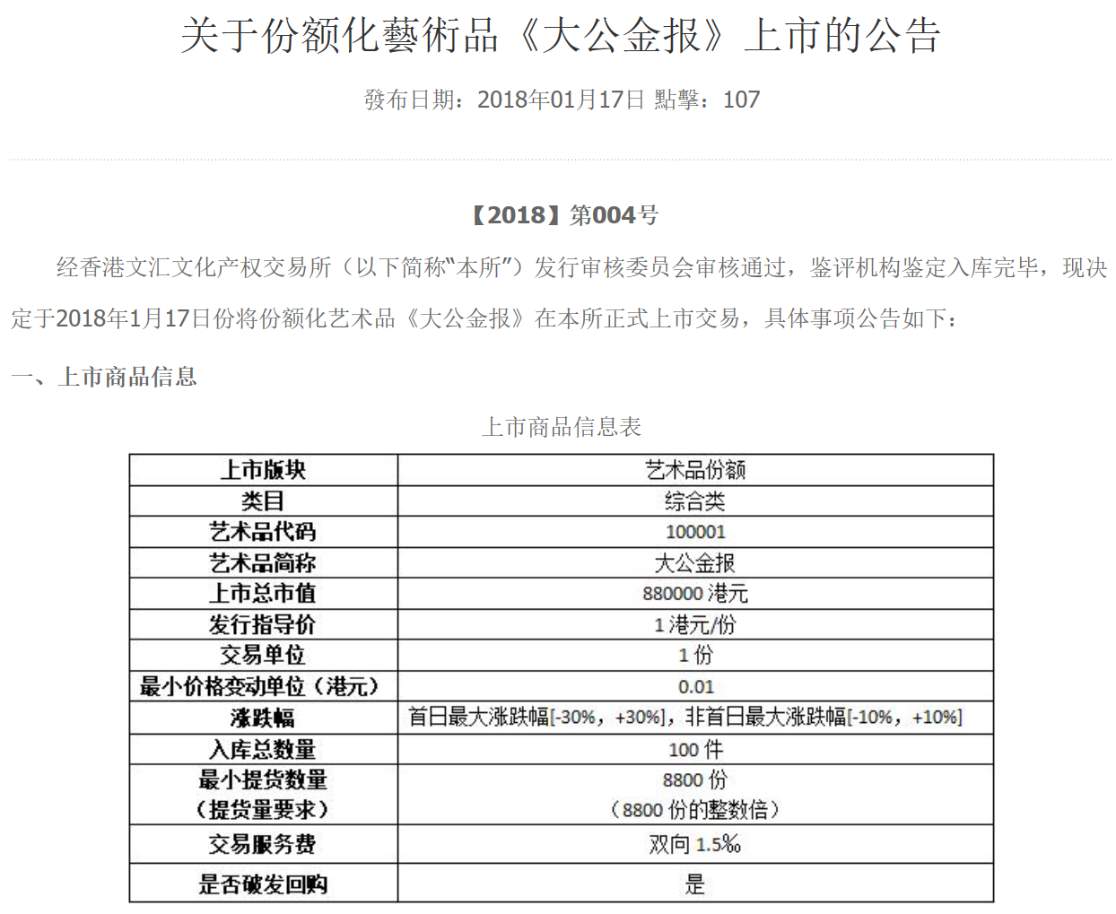 文汇报旗下香港文汇交易所官网显示,确有名为“大公金报”的项目于2018年1月上市,上市总市值仅为88万港元,发行指导价每份为一港元。据公告介绍,大公金报是黄金制作的同比例《大公报》创刊号,属艺术品。