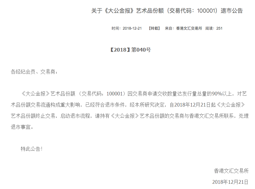 2018年12月发布的公告显示,大公金报艺术品份额因交易商申请交收数量达发行量总量的90%以上,对艺术品份额交易流通构成重大影响,已经符合退市条件,自2018年12月21日起《大公金报》艺术品份额终止交易,请持有大公金报艺术品份额的交易商与香港文汇交易所联系,处理退市事宜。