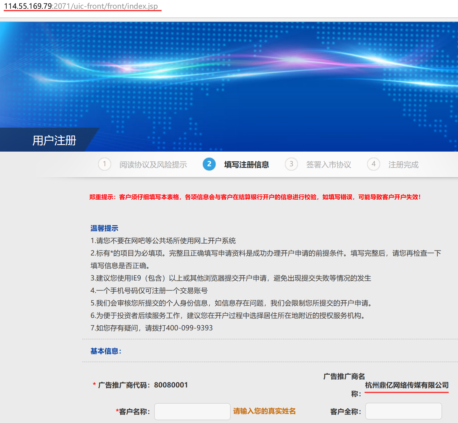 受害者提供的投资项目显示,参与运作大公金报项目的广告推广商公司名字为杭州鼎亿网络传媒有限公司(下称 “杭州鼎亿”),其投资链接也与香港文汇交易所的官方链接不同,打款方式是通过转账给文汇文化产业(海南)有限公司(下称 “文汇文化产业(海南)”)的招商银行账户。投资者表示,相关客服宣称其由招商银行资金托管的,资金安全。