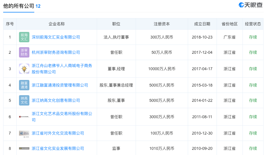 香港文汇文化产权交易所有限公司的对外投资还包括深圳前海文汇实业有限公司(下称 “前海文汇实业”)。前海文汇实业法人刘波担任高管的浙江中泰国际文化交流中心有限公司被列为失信公司,其同样在浙江省多家企业任职,部分属文化类企业。