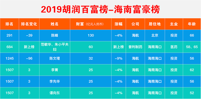 10月10日,胡润百富官网发布《2019胡润百富榜》。在上榜的名单中,海南共有6人或家族上榜,其中海航集团的陈峰以130亿元位列291位,是上榜的海南首富,普利制药的范敏华、朱小平夫妇以60亿元位列海南第二位,居总榜单第684位;海航集团的陈文理、李菁、李先华、谭向东也进入了本次榜单。