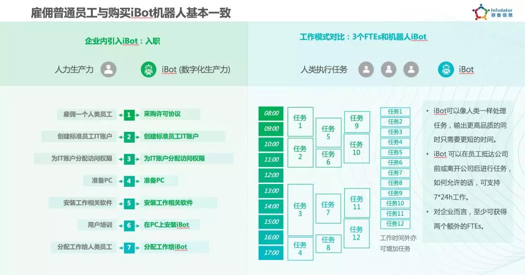 “当前的市场行情,一个RPA机器人一年只需要3-5万元的年订阅费用,对比一个人类员工一年的工资支出,RPA要划算得多。”柴亚团进一步解释道,“和雇佣一个人类员工几乎一样,只不过前者是一个采购合同,后者是一个雇佣合同。”