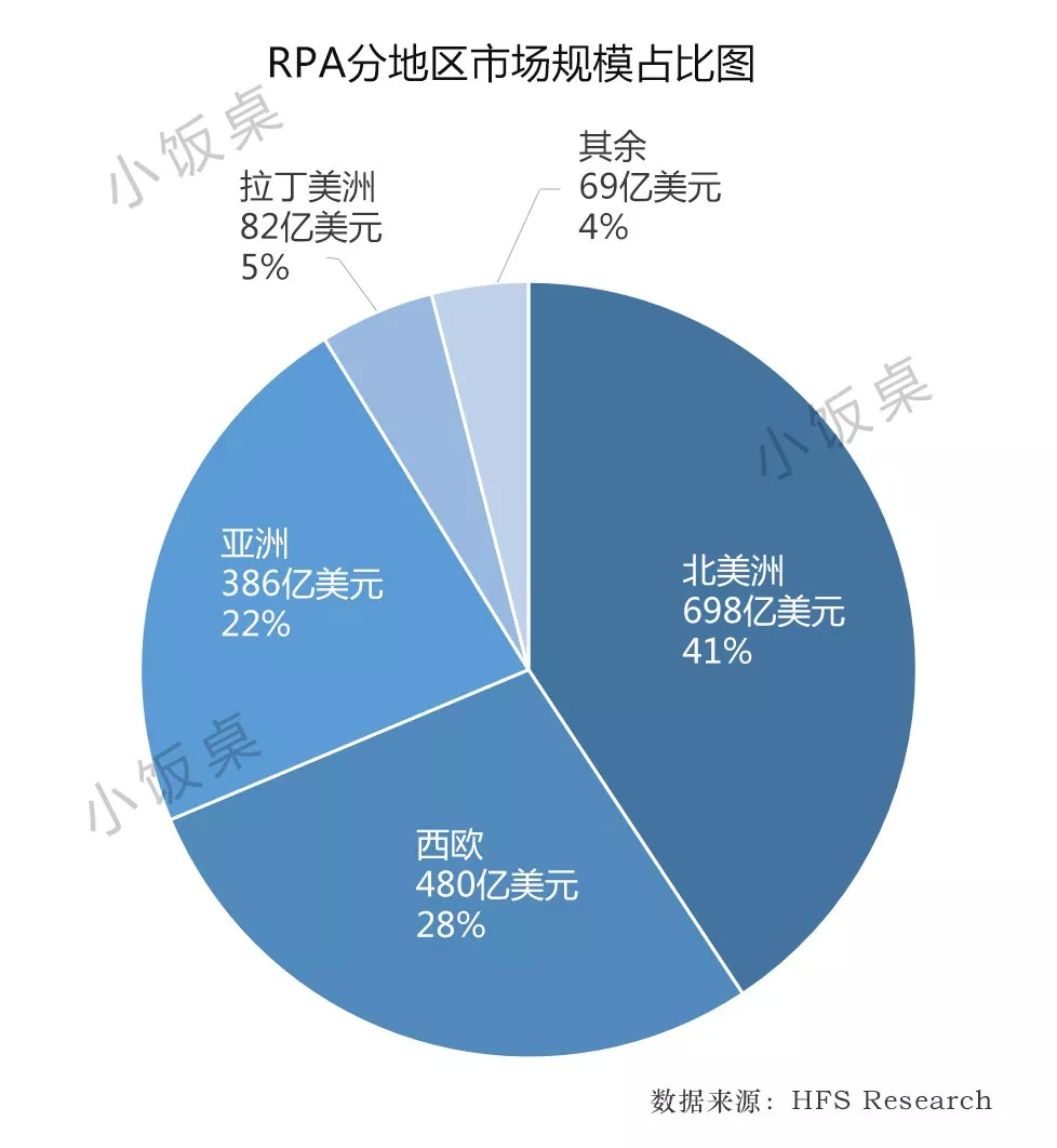 市场研究公司HFS Research发布的研究报告显示,2018年全球的RPA市场规模仅17亿美元,具体到RPA厂商瞄准的软件市场规模仅4.6亿美元,其余更大的市场都是提供产品部署和个性化开发的RPA服务。