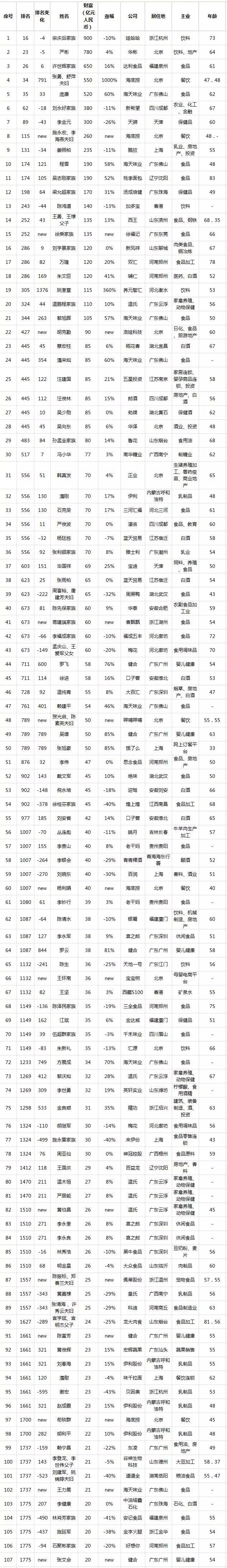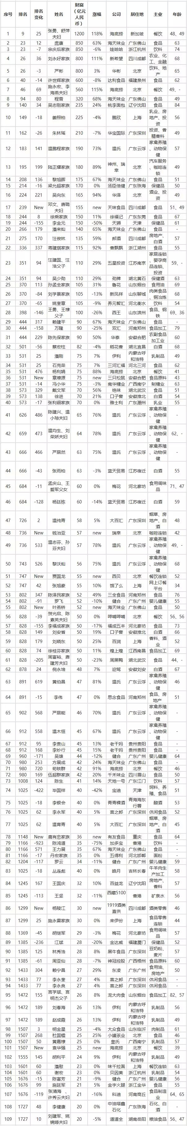 今年入围上述子榜单前10名的还有(按排名先后顺序):新希望的刘永好家族(800亿元),华彬的严彬(800亿元),达利食品的许世辉家族(600亿元),海底捞的施永宏、李海燕夫妇(560亿元),海天味业的程雪(320亿元),桃李面包的吴志刚家族(235亿元)。