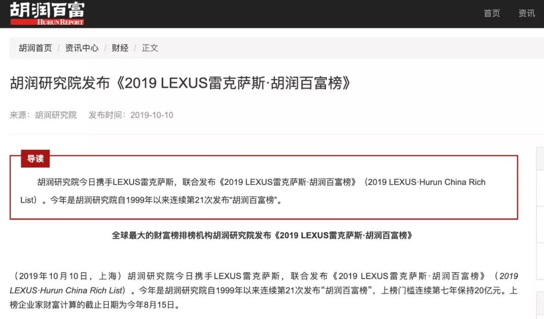 《2019胡润百富榜》指出,马云以2750亿财富第三次成为中国首富;马化腾财富上涨200亿,以2600亿重返第二。地产商许家印财富缩水400亿,以2100亿退居第三。19人财富上千亿,为历年最多;这些财富上千亿的企业家中,居住在广东的最多,有7位;其次是浙江和江苏,分别有3位;再次是上海,有2位。