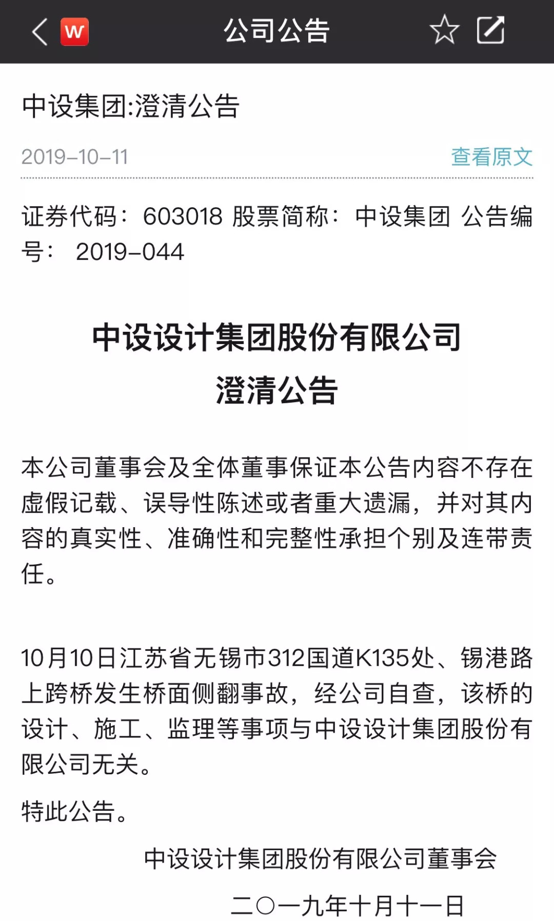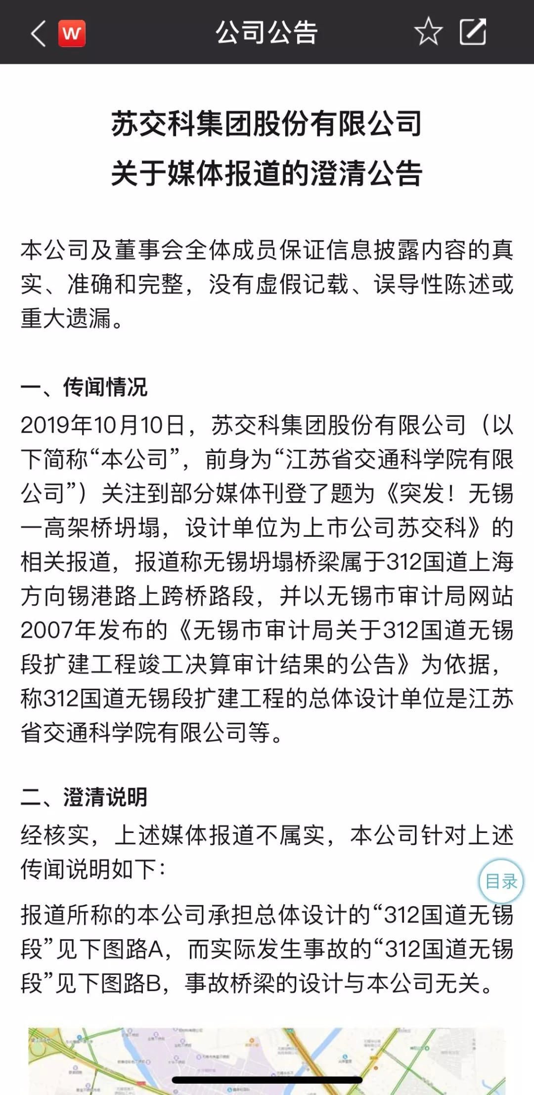 10月11日一早,苏交科即发布澄清公告否认为事发路段的总体设计方。