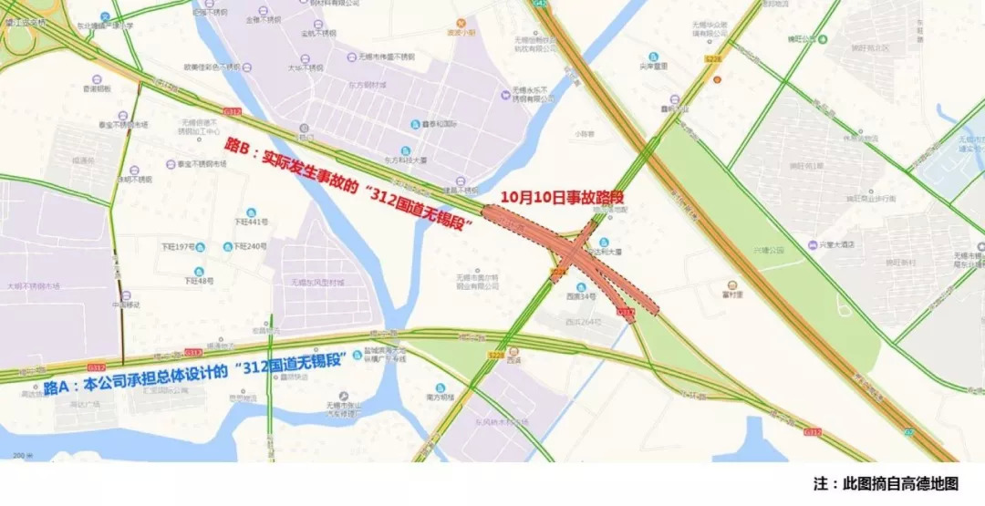 其称,报道所称的本公司承担总体设计的“312国道无锡段”见下图路A,而实际发生事故的“312国道无锡段”见下图路B,事故桥梁的设计与本公司无关。