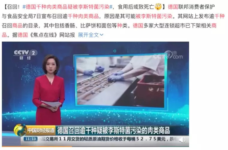 德国联邦消费者保护与食品安全局7日宣布召回逾千种肉类商品,原因是其可能被李斯特菌污染。其网站上发布逾千种召回商品的目录,其中包括香肠、比萨饼和面包等种类。德国多家大型连锁超市已下架相关商品。