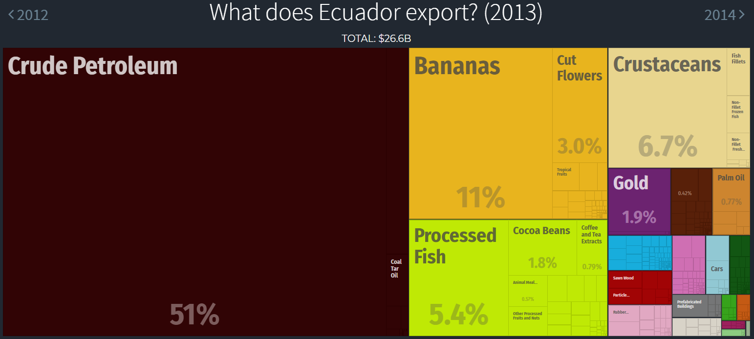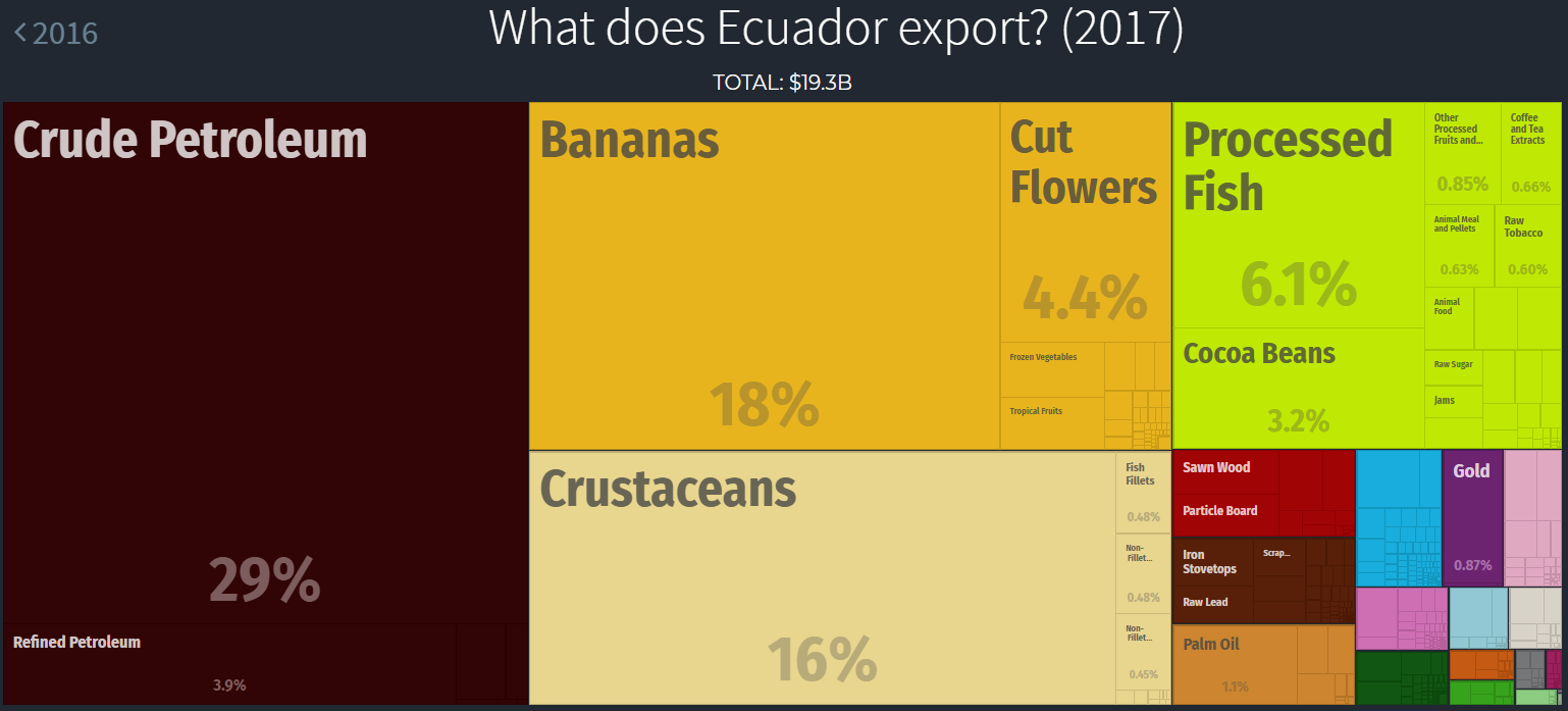 作为石油输出国组织欧佩克的正式成员,厄瓜多尔拥有82.73亿桶的已探明石油储量,同时还是世界最大的香蕉出口国以及可可、咖啡的主要生产国。