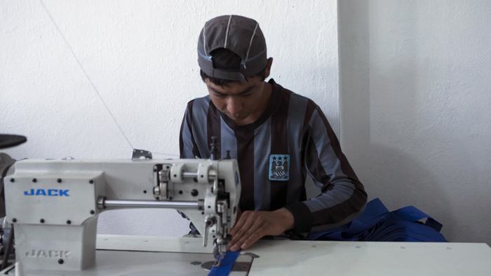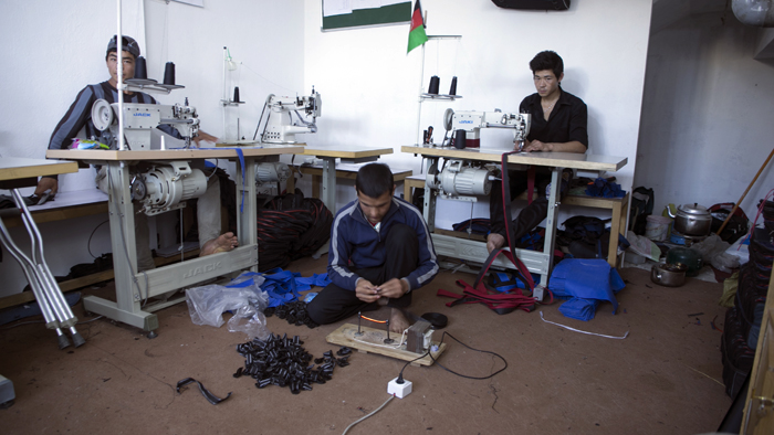 现在,就业中心的人们靠制作书包为生,大约每天能挣2.5美元。