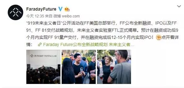 据悉,毕福康到任后,FF产品交付规划调整、研发及运营成本削减、组织架构调整以及更重要的融资策略调整等皆得以推动,并作出民全新的战略规划。FF预计将在融资成功后9个月内实现FF 91量产交付,并在15个月内完成FF 81公开发布,以及未来车型和下一代核心技术的开发准备;IPO方面,FF宣布,在融资完成后12至15个月内实现IPO。