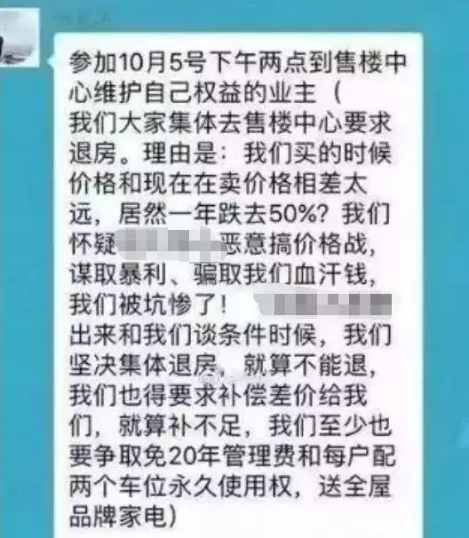 此外,肇庆一盘一年跌50%,业主依旧是要求退房,如果不能退,希望房企可以补偿差价或是免20年管理费和每户配两个车位的永久使用权。