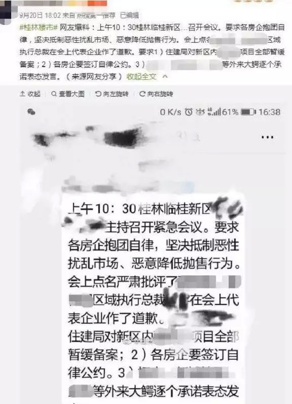 随后,桂林临桂新区区长主持召开紧急会议,要求各房企抱团自律,坚决抵制恶性扰乱市场、恶意降低抛售行为。此外,会上点名严肃批评了某房企,该房企领导还在会上代表企业作了道歉。