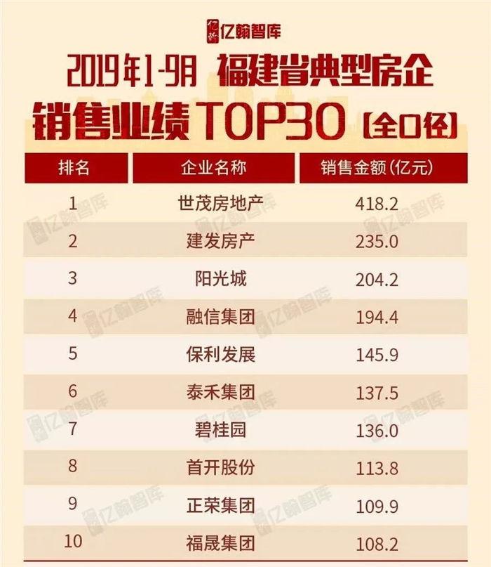 据亿翰智库日前发布的《2019年1-9月福建省典型房企销售业绩TOP30》,世茂海峡发展公司再次以绝对优势占据榜首,以418.2亿元销售额在福建区域继续保持领头羊地位。