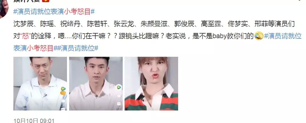 导演组为节目的热度在发光发热,演员们同样也在力所能及地贡献话题。除每位演员官宣之时为节目的宣传造势外,官方前两日放出的一段《怒目》表演小考片花,不少演员的“尴尬”表现再一次将还未播出的《演员请就位》送上热搜。