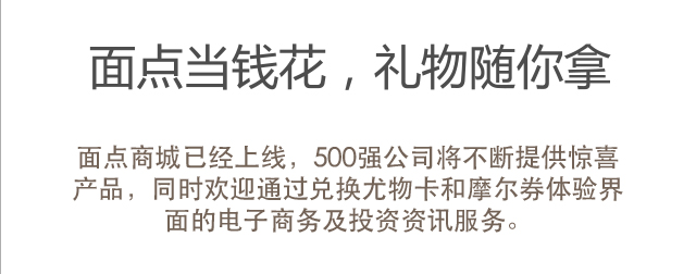 目前,面点系统还只是一个起步,用户可以用面点购买摩尔金融的投资资讯,到尤物的商城里购物,也可以兑换电影票、专车券等。接下来,我们还希望有更多独特性体现在这里,例如与创业导师的一次午餐机会、参观一个机器人工厂或者一次有意义的公益之旅,面点商城将成为这些活动的入口之一。因此,我们也需要有想法的合作伙伴加入,可以发送邮件到这个地址与我们联系:miandian@jiemian.com。