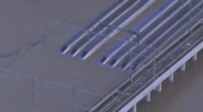 JR东日本称,台风“海贝思”引发的暴雨导致千曲川洪水泛滥,位于长野市赤沼的车辆中心有新干线车辆被水淹。