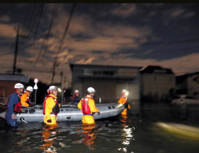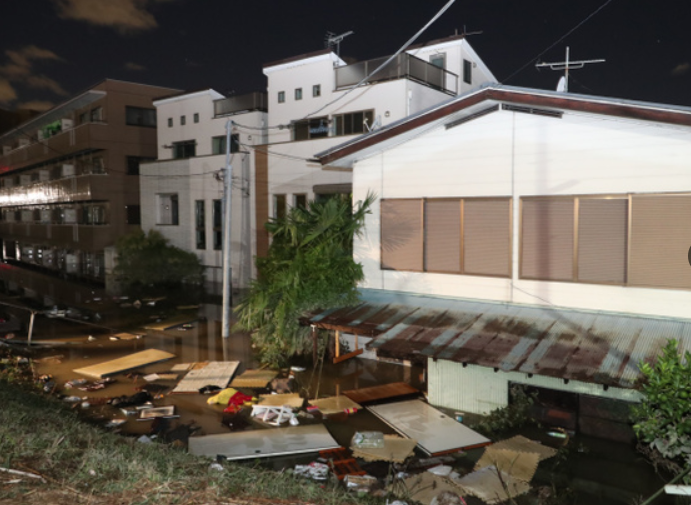 目前台风带来的暴风强降雨天气造成许多河流都已达到泛滥水位。13日早上6时左右,通过监控观测到长野县穗保的千曲川一部分堤坝疑似决堤,河水蔓延至住宅区。当地有老人院处于孤立状态,消防部门已开始用小船展开救援。