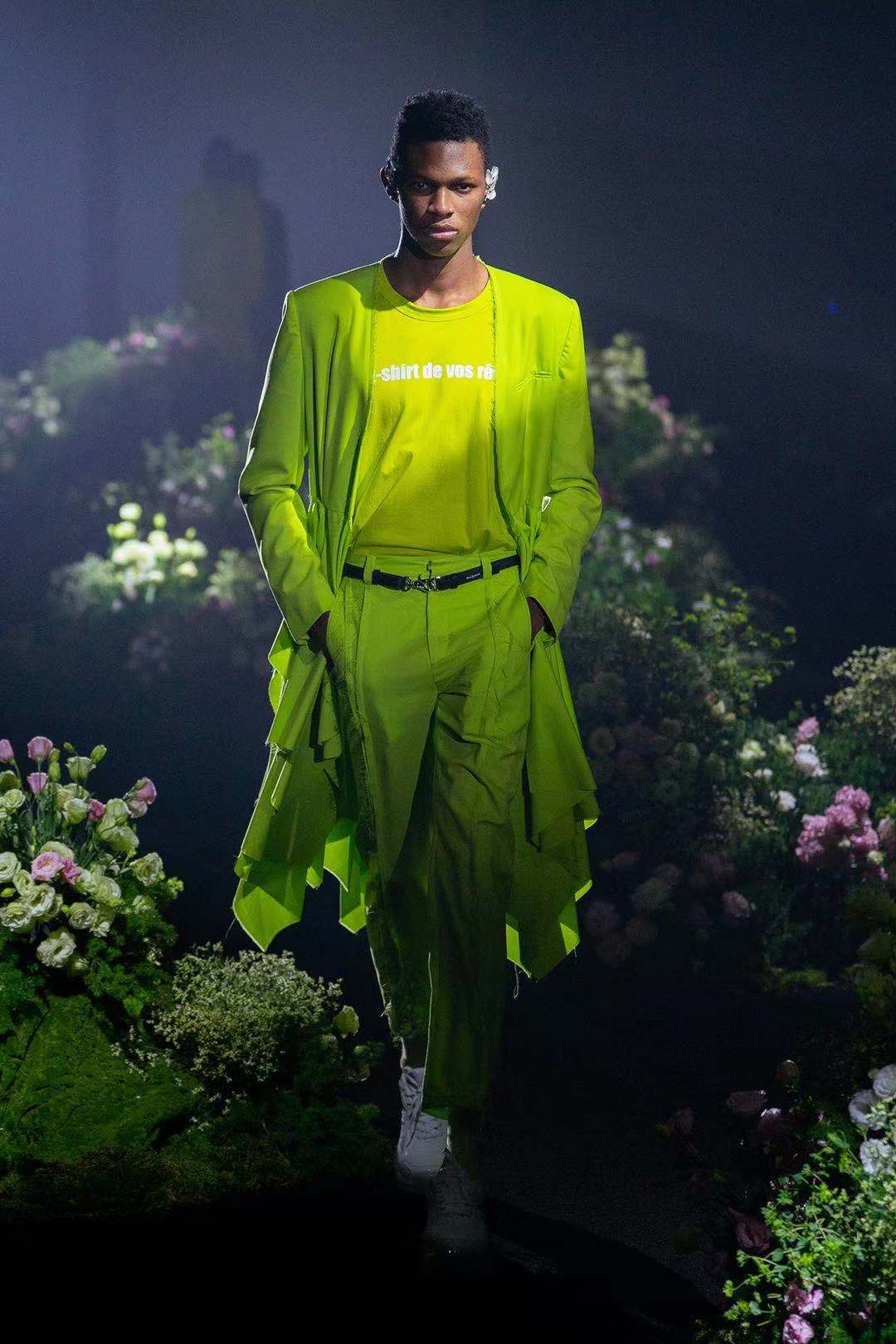 几束洁白的灯光照射在地面的花团上,分明盛开的玫瑰远看起来像是那些在潮湿幽暗中生长的青苔。在Zickness 2020春夏系列的秀场上,这种梦幻乌托邦与现实世界之间的微妙转换在时刻上演,一如其主题“Un rêve très fade (寡味之梦)”一般,叙述了一个梦幻而又清醒的故事。