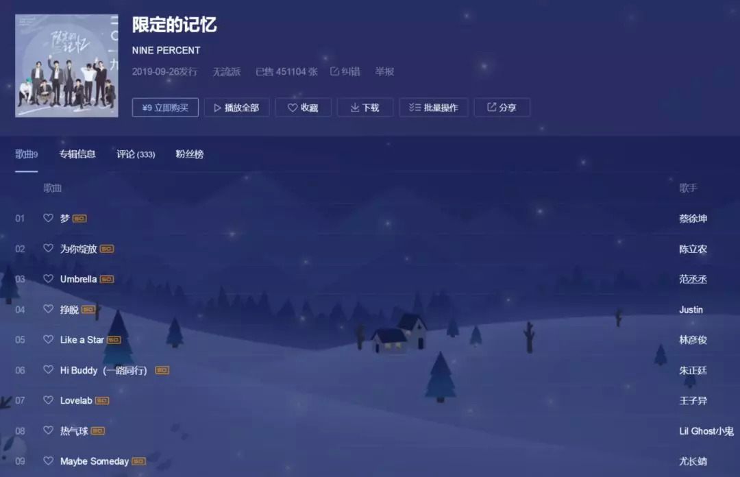 NPC第一轮巡演过后,终于在出道半年后推出了第一张专辑《TO THE NINES》,但也仅有主打歌《创新者》得到了展示的舞台。出道后承诺的团综《百分九少年》,在无限的延后中变成了解散前才得以拍摄、一人一集的纪实真人秀《限定的记忆》,而前不久上线的同名二专,只有9首每个人的solo歌曲,并没有团体歌曲。