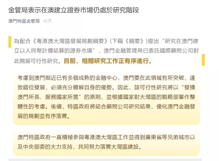 澳门金管局今日表示,为配合《粤港澳大湾区发展规划纲要》提出“研究在澳门建立以人民币计价结算的证券市场”,澳门金融管理局已委托国际顾问公司对此开展可行性研究。目前,相关研究工作正有序进行。考虑到澳门邻近已有多个成熟的金融中心,澳门要在此领域有所突破,达致错位发展,必须充分了解自身的优势。因此,该可行性研究将以“发挥澳门所长、服务国家所需”的原则,并根据国家对大湾区的战略部署作整体性的考虑。