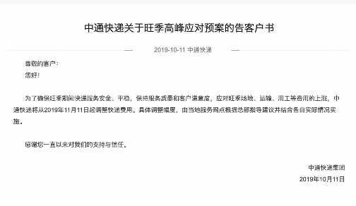 没有意外,在“双11”前,快递企业将收费涨价。近日,中通快递《关于旺季高峰应对预案的告客户书》显示,应对旺季场地、运输、用工等费用的上涨,该公司将从2019年11月11日起调整快递费用。具体调整幅度,由当地服务网点根据总部指导建议并结合各自实际情况实施。