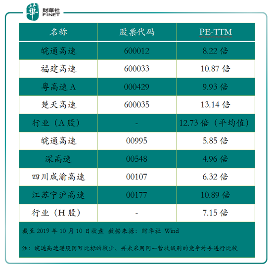 截至2019年10月10日,高速公路行业的PE(市盈率)低于10倍,创6年来的新低。其中,安徽皖通高速(00995-HK)(600012-CN)PE估值仅为8.2倍,远低于行业平均值及同业竞争对手。