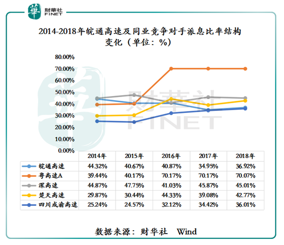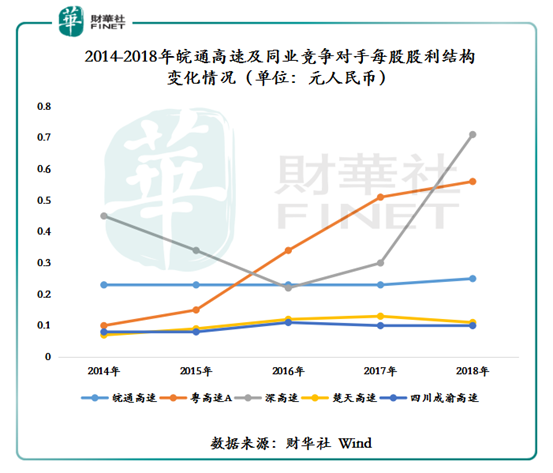 另外,从历年每股股利的结构变化,也能看出低估值背后的逻辑关系。截至2018年底,皖通高速每股股利为0.25元,较2014年的0.23港元,年复合增长率为2.1%。反观粤高速,从2014年的0.10元增至2018年的0.56元,年复合增长率为53.83%,深高速从2014年0.45元增至2018的0.71元,年复合增长率为12.07%。对此,我们不难发现,股价或估值高于行业平均值的上市企业,往往每股股利表现不会太差。