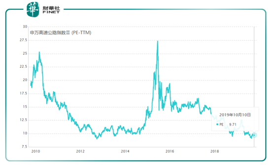 据财华社数据统计,截至2019年10月10日收盘,申万高速公路指数II的市盈率PE为9.71倍,是近六年来的新低。这意味着我国二级资本市场收费高速公路行业的估值处于历史较低的水平。