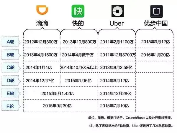 2015 年 7 月,滴滴快的宣布完成 20 亿美元 F 轮融资,而这距离其 1.42 亿美元 E 轮融资仅过去两个月。9月,滴滴快的再次宣布,F 轮融资加入了新的投资者,20 亿美元变成了 30 亿美元,估值上升至 165 亿美元。同一个月,Uber 在中国的独立注册公司雾博也完成了 12 亿美元 A 轮融资。2016年 1 月,优步中国又完成了约 20 亿美元 B 轮融资。