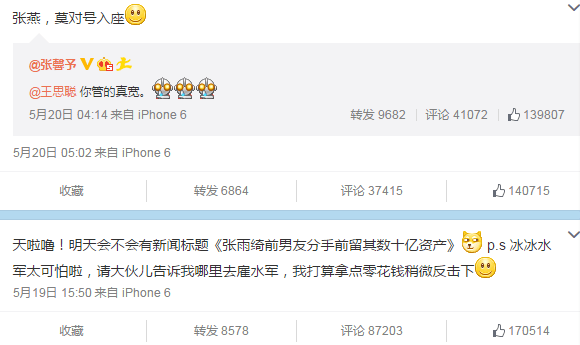 从当时吃惯了山珍海味对东北土味十分不满的思聪手撕张馨予开始,就一发不可收拾了。然而思聪是比孕、死、婚、出轨等更好使的话题,搭上他可以飞跃至娱乐圈云端,我们都知道,张馨予不可能不知道。于是回复来回复去飙升至头条,狠狠“微博压”了一把范冰冰,比艳压更爽利。