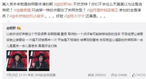 由于周杰伦上座而关注度极高的《中国好声音》,在被眼尖观众发现那英老师迷幻的发型变变变后。思聪悠悠指出:真人秀都是演的。深藏功与名,娱乐圈这点事儿你们凡人不懂,naive