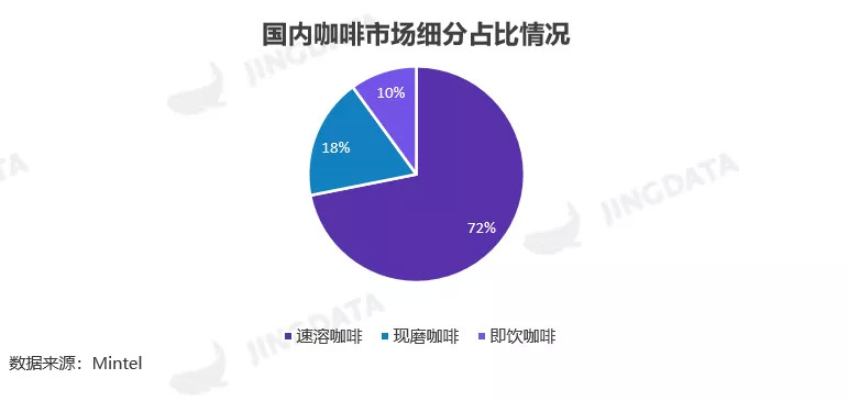 中商产业研究院报告显示,2018年中国咖啡市场规模突破2000亿元,预计2020年将有望突破3000亿元[1]。在细分品类中,速溶咖啡作为老大,占比约72%,现磨咖啡占18%,即饮咖啡则在10%左右。