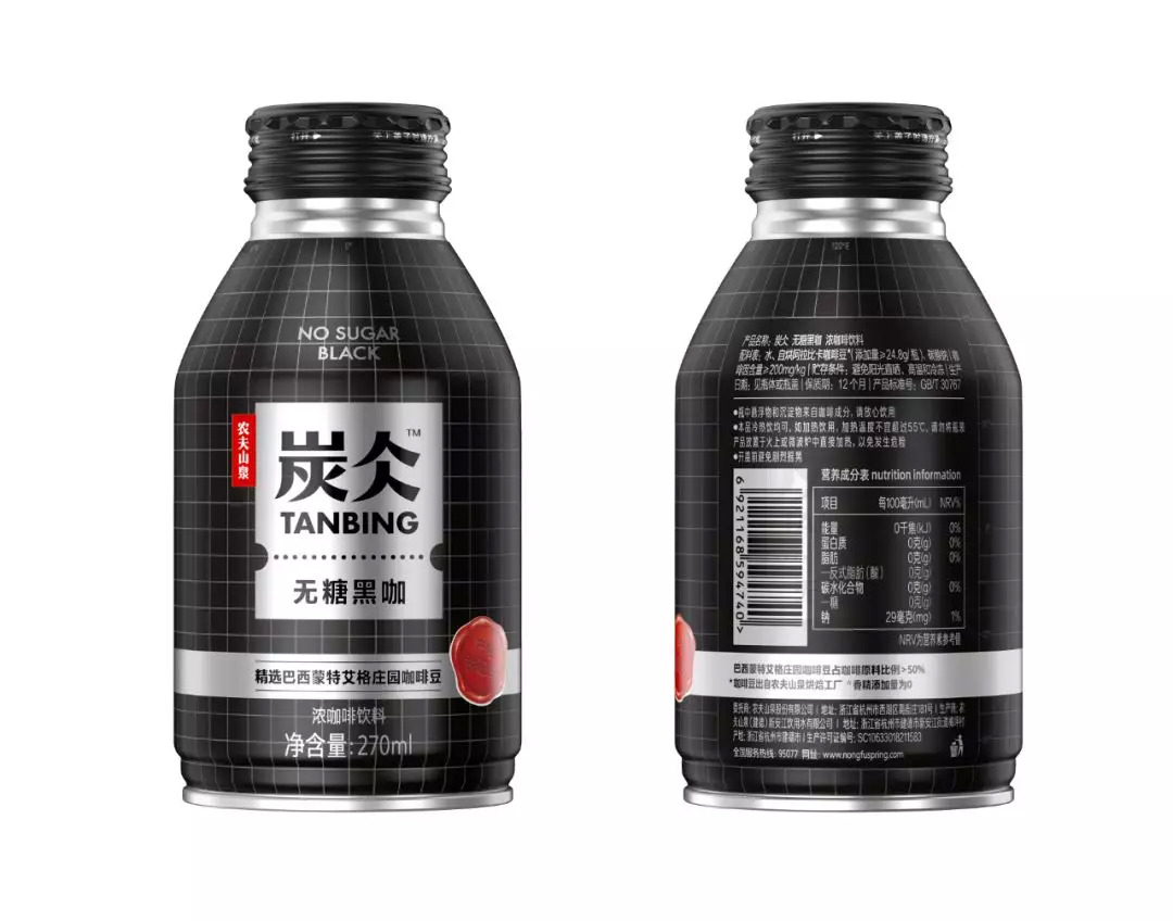 农夫山泉炭仌上市后的第一款产品是碳酸咖啡,选用了埃塞俄比亚产区和巴西产区的高品质咖啡生豆,通过意式冷萃技术,将咖啡的香、浓、醇保存在咖啡萃取液里。